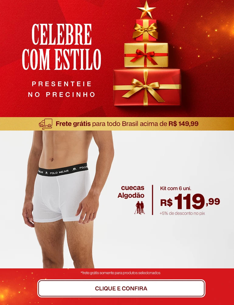 Um presente útil não precisa ser sem graça. O de cuecas boxer da Polo Wear eleva o essencial a um novo patamar. Com designs modernos em tons de azul e cinza, e o logotipo da marca em destaque, elas oferecem o ajuste perfeito e conforto duradouro. Embaladas em uma elegante caixa branca com um laço vermelho vibrante, este é o presente que combina necessidade com um toque de luxo e cuidado.