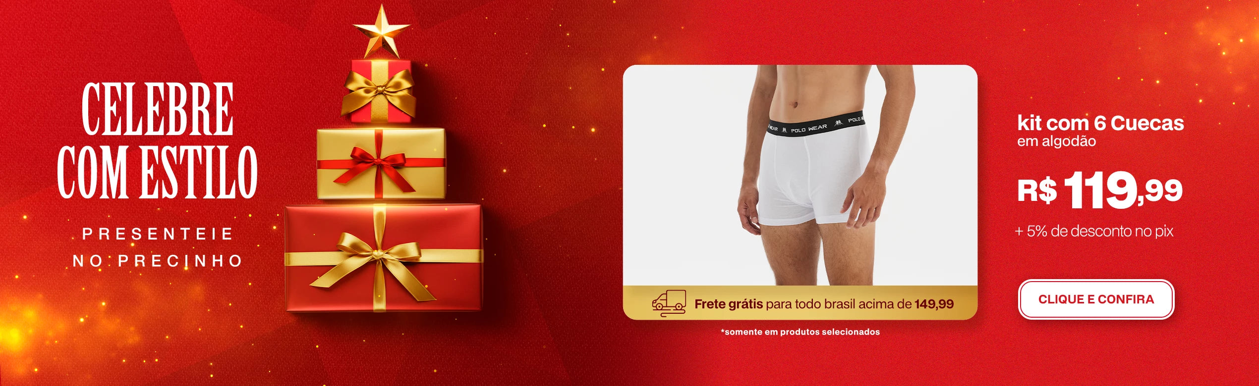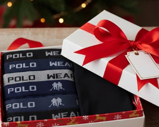Um presente útil não precisa ser sem graça. O de cuecas boxer da Polo Wear eleva o essencial a um novo patamar. Com designs modernos em tons de azul e cinza, e o logotipo da marca em destaque, elas oferecem o ajuste perfeito e conforto duradouro. Embaladas em uma elegante caixa branca com um laço vermelho vibrante, este é o presente que combina necessidade com um toque de luxo e cuidado.